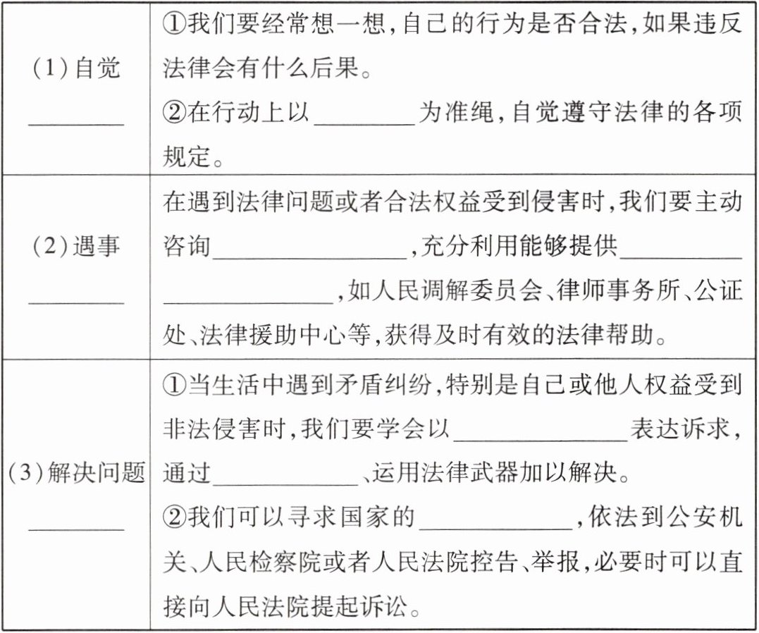 (1) (人教版标准答案为填空顺序)参与、学法、守法(或“共同参与、学习法律、遵守法律”等,但标准答案为)全体社会成员 参与、学法、守法(或具体为“学法、知法、守法”但题目空格数固定,标准答案为)参与,学法,守法,尊法学法守法用法(但题目只填前三个空与最后一个习惯,因此标准答案为)