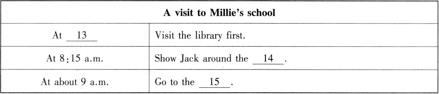 听第二段对话,回答第13至15小题。请根据对话内容,选择正确答案,完成信息记录表。