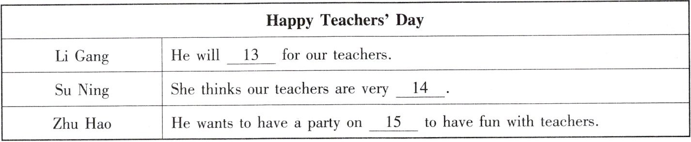 | Li Gang | He will _13_ for our teachers. |