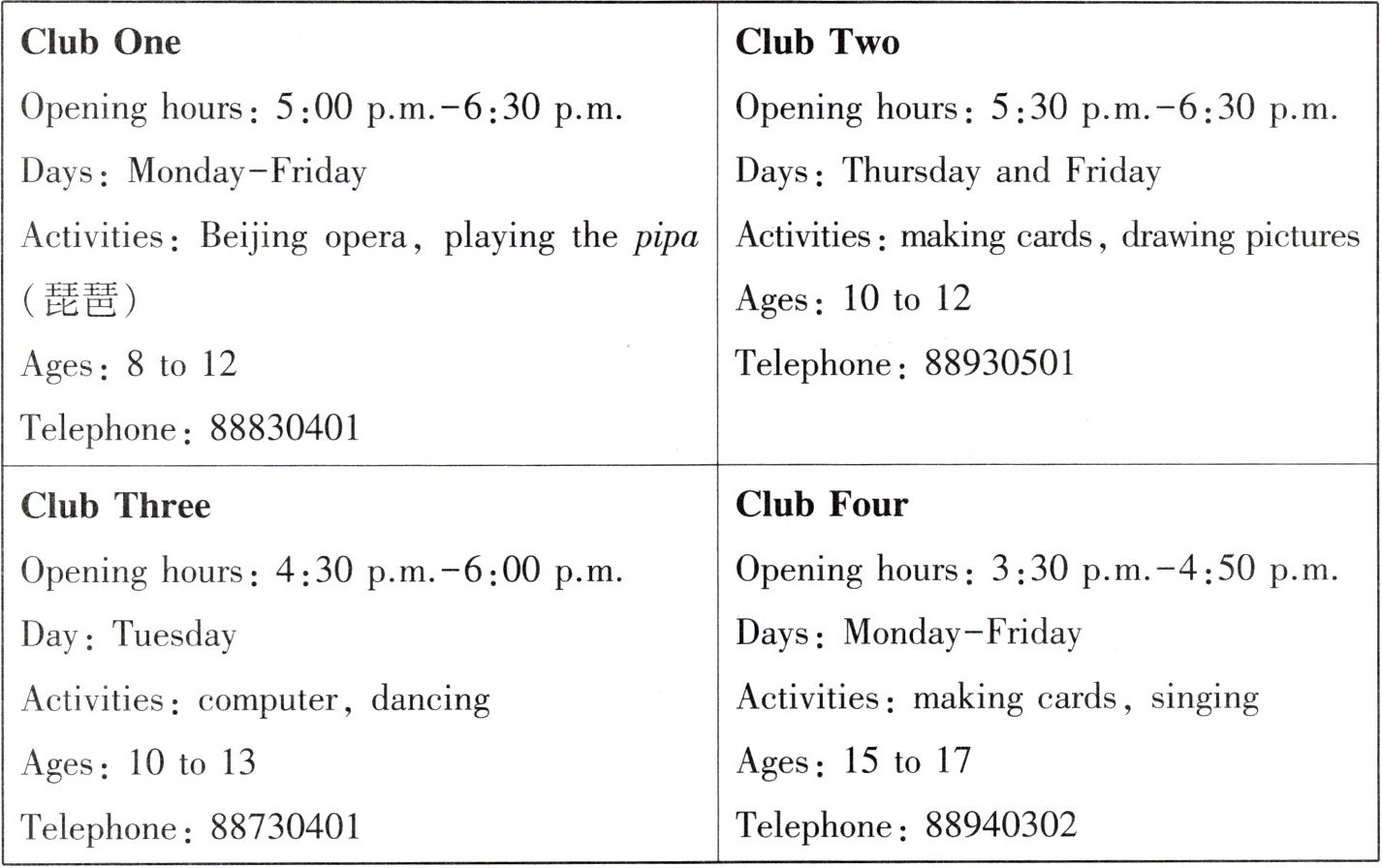 ) 1. You can go to ______ if you have time from 3:30 to 4:30 in the afternoon.A. Club One