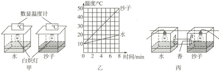 相同的水和沙子,用规格相同的白炽灯模拟太阳对箱中的水和沙子加热,是为了保证相同时间内水和沙子吸收的热量相同。(2)依据实验数据描绘的水和沙子的温度随时间变化的图像如图乙所示,可知在相同时间内,沙子升高的温度比水升高的温度