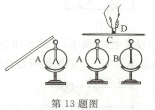13. 验电器A、B原本均不带电。如图所示,先用丝绸摩擦过的玻璃棒接触验电器A,A的金属箔张开;再用带绝缘柄的金属棒同时接触验电器A、B的金属球,发现A的金属箔张角变小,B的金属箔张开。下列说法正确的是(