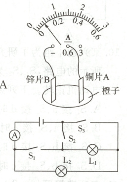 14. 小明将铜片A和锌片B插入橙子中,就制成了一个水果电池。他用导线将电流表的两个接线柱分别连在铜片A和锌片B上,观察到电流表指针发生了偏转,如图所示。关于该电路,下列说法正确的是(