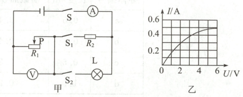 26. (9分)如图甲所示电路,电源电压为17V,滑动变阻器$R_1$的铭牌标示“100$\Omega$ 1A”,电流表量程为0~0.6A,电压表量程为0~15V,灯泡的额定电压为6V,其I-U关系如图乙所示。只闭合开关S和$S_1$,滑动变阻器的滑片P置于最右端时,电压表的示数为10V。在保证各元件安全工作的情况下,求: