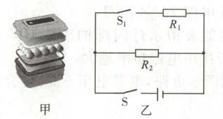 18. 图甲是某款鸡蛋孵化器,底部装有加热器。通电后,加热器对水加热,水向上方鸡蛋传递热量,提供孵化所需能量。孵化器简化电路如图乙所示,$R_1$、$R_2$都是发热电阻,孵化器相关参数如下表所示。
