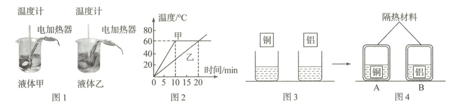 (1)他将质量均为$250 g$的甲、乙两种不同的液体分别放入两个相同的烧杯内,用相同的电加热器同时加热,如图1所示;记录相关数据,并绘制如图2所示的图像(不计热量损失)。