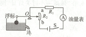 10. 如图所示是一个油量表的示意图,滑动变阻器规格为“20 Ω 1 A”。闭合开关,当浮球最低时滑片 P 滑到 a 端,电流表示数为 0.3 A,当浮球最高时,滑片 P 滑到 b 端,电流表示数为 0.5 A。下列说法错误的是(