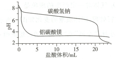 (4)已知铝碳酸镁片是当今的主流抗酸药。为探究铝碳酸镁片相比碳酸氢片的优势,实验室用$\mathrm{pH}=1.5$的稀盐酸模拟胃酸过多时的胃液,将上述稀盐酸以相同的滴速分别滴入等质量两种药粉的悬浊液中,测得$\mathrm{pH}$随滴入盐酸体积的变化如图所示。结合图像分析,铝碳酸镁片作为抗酸药除了能将胃液的$\mathrm{pH}$保持在3~5之间,减少胃部不适,还具有的优势为