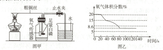 20. (12分)小金利用如图甲所示装置(气密性良好)和试剂测定空气中氧气含量,集气瓶中空气的体积为$200\ mL$,氧气传感器测得集气瓶内氧气的体积分数变化曲线如图乙所示,集气瓶内气压变化曲线如图丙所示。