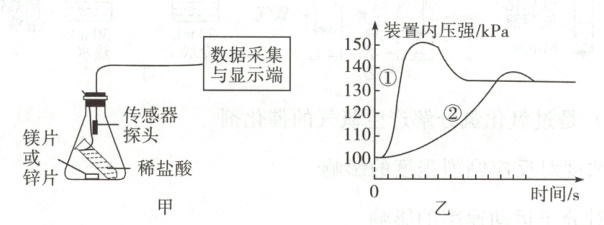 9.(2024·绵阳)室温时,利用压强传感器研究质量相同的一块镁片和一块锌片分别与等浓度、等质量的稀盐酸反应的实验如图甲,压强传感器测得装置内压强随时间的变化关系如图乙。下列说法正确的是()