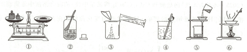 (2)下图是小明除去粗盐中不溶性杂质的实验操作过程。按实验操作考试评分标准评价,1个错误操作扣1分,小明被扣2分,他的错误操作是(填序号)。