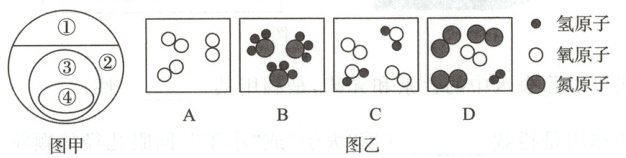 (1)图甲表示的是纯净物、单质、化合物、含氧化合物、氧化物之间的关系。若整个大圆圈代表纯净物,则①②③④所属的物质类别分别是、、、。
