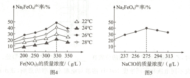 ②反应的温度、原料的浓度和配比对$ Na_2 FeO_4$的产率都有影响。图4为不同反应温度下,$ Fe(NO_3 )_3$质量浓度对$ Na_2 FeO_4$产率的影响,图5为一定温度下,最佳$ Fe(NO_3 )_3$质量浓度时,$ NaClO$的质量浓度对$ Na_2 FeO_4$产率的影响。