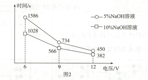 (2)为探究不同电压和不同浓度$ NaOH$溶液对电解水速率的影响,该小组同学进行多次实验,测得产生20 mL $ H_2$所需时间如图2所示。
