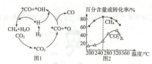 用∗标注),反应相同时间,含碳产物中$CH_{4}$的百分含量及$CO_{2}$转化率随温度的变化如