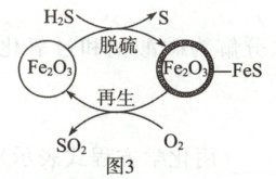 $Fe_{2}O_{3}$可用作脱除$H_{2}S$气体的脱硫剂。$Fe_{2}O_{3}$脱硫和$Fe_{2}O_{3}$再生反应如图3。