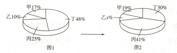 15.甲、乙、丙、丁四种物质在密闭容器中混合,此时各物质的质量分数如图1所示。在一定条件下,反应一段时间后,各物质的质量分数如图2所示。下列说法正确的是(