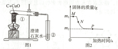 13. 某实验小组按图1进行木炭还原氧化铜的实验,实验时试管①中固体的质量随加热时间的变化如图2所示。下列分析正确的是(