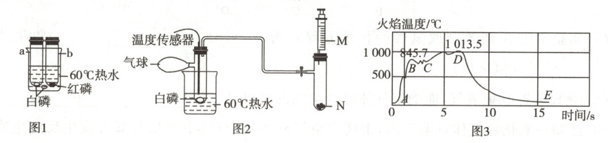 如图1,烧杯中装有$60° C$水,底部放白磷。试管a、b中分别放入白磷与红磷,塞上橡胶塞,放入烧杯中。观察到只有试管a中有白烟生成。