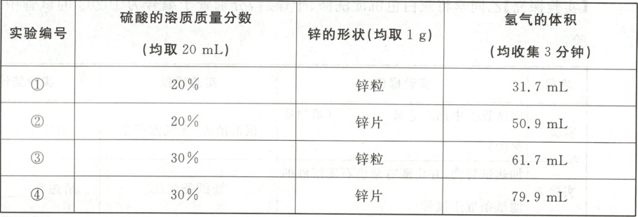 实验①②对比说明;要比较不同溶质质量分数的稀硫酸对反应快慢的影响,应选择的实验编号是。由此得出锌的形状和稀硫酸的溶质质量分数都会影响锌与稀硫酸反应快慢。