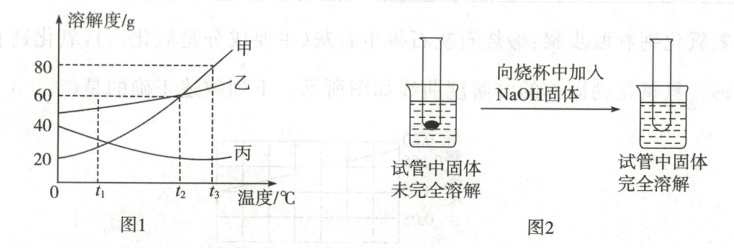 13.甲、乙、丙三种固体的溶解度曲线如图1所示,图2是选用图1中某种固体进行实验的情况。