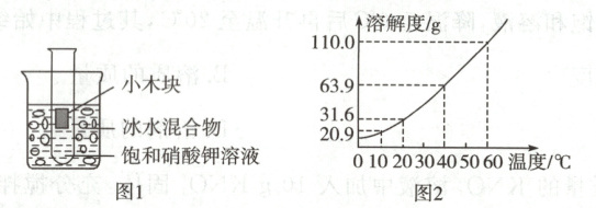 11.某兴趣小组用硝酸钾进行了系列实验,如图1所示,试管内盛有$20^{\circ}C$的硝酸钾饱和溶液,其上漂浮一小木块,图2为硝酸钾溶解度与温度的关系。将试管插入烧杯内的冰水混合物中,一段时间后,下列有关说法错误的是(