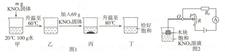 (填“饱和”或“不饱和”)溶液。(3)如图2所示,电源两端的电压保持不变,$\mathrm{R_0}$为定值电阻,$\mathrm{R}$为滑动变阻器的电阻片,滑片P与滑杆的一端连接,滑杆可以绕固定轴O转动,另一端固定一个木块。若向烧杯中加入少量$\mathrm{NaCl}$固体,充分溶解后,电流表的示数
