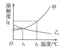 。②$t_2\,^{\circ}\mathrm{C}$时,将等质量的甲、乙两种物质加水溶解配制成饱和溶液,所得溶液质量的大小关系为甲
