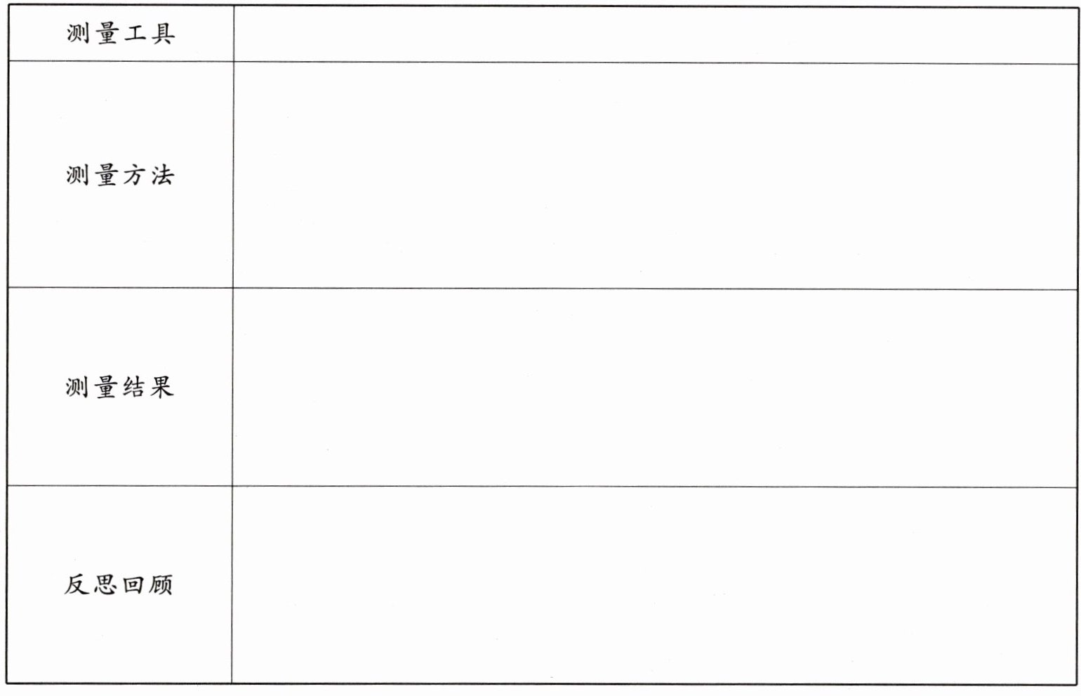 | 反思回顾 | 在测量过程中,要确保测量工具的准确性和测量方法的正确性。同时,要注意安全,避免在测量过程中发生意外。 |