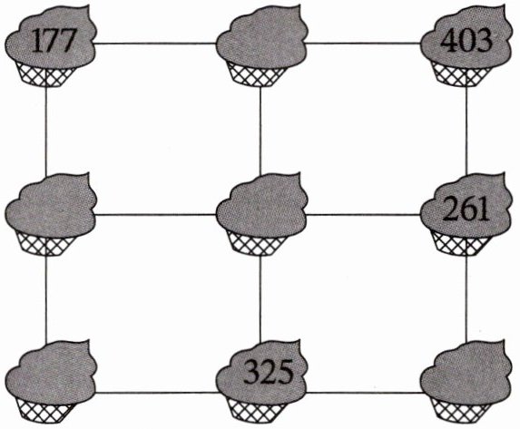 6.(数学游戏)在 里填上合适的数,使每一横行、每一竖列上的三个数相加的和都是 888。