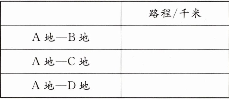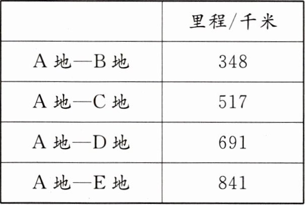 3. 根据“A地—E地”的火车里程表和线路图,回答下列问题。