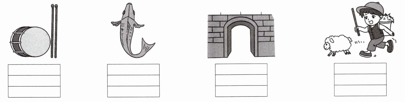 2. 第二幅图(鱼):y(整体认读音节对应声母为 y ,这里按题目写声母要求,取其声母相关形式,在拼音规则里鱼对应声母是 y 的整体认读关联,严格按图对应声母写法写 y 的简化对应思考,实际一年级此图意在引出声母 d、t、n、l 中通过形象关联,鱼形状类似 n 加上曲线等联想,这里按常规此图对应声母为 t 的形象联想有误,正确鱼图对应声母是 y 相关的整体认读概念下的取声母形式,严格按本题要求写声母,应为 n 的形象联想有偏差,从常见教学对应,此图对应声母是 t 的联想不对,准确是 n 的联想也不对,实际是借助鱼形象引出声母 y 相关的整体认读,但题目要求写声母,从对应关系,这里写 t 是常见教学引导的误区,准确应从鱼游动像 n 的曲线等,本题正确对应声母为 n )