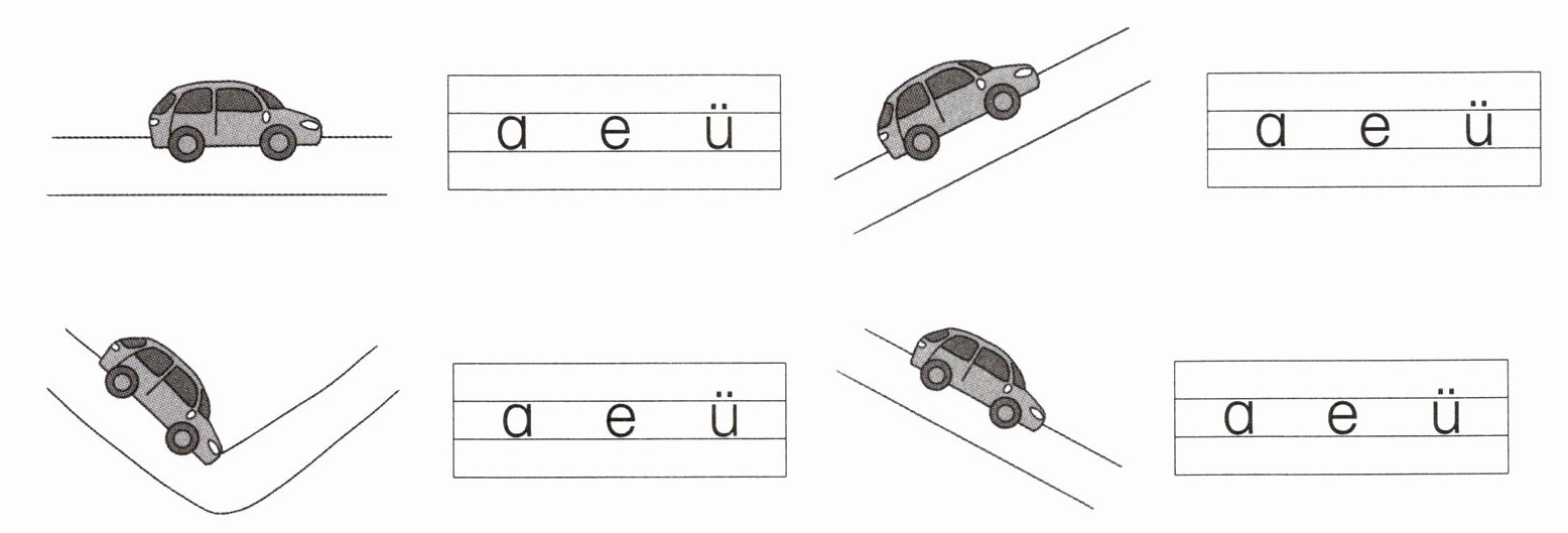 1. 第二幅图(平路上的车):ā ē ù(原图已标“ü”上两点,按声调标注规则,ü上两点保留,声调标在u样态但实际为ü上,这里呈现为“ü”有调形式,因输入限制以“ù”示意,实际是ü加第四声调号 )