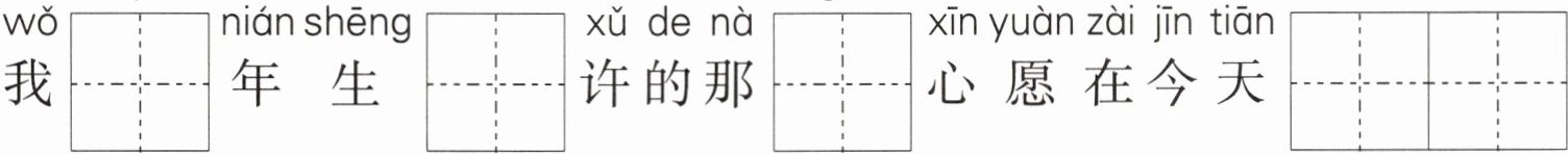 我$\overset{\mathrm{q}\mathrm{ù}}{\begin{array}{l}□ \\ □ \end{array}{\begin{array}{l}□ \\ □ }$年 生$\overset{\mathrm{r}\mathrm{ì}}{\begin{array}{l}□ \\ □ \end{array}{\begin{array}{l}□ \\ □ }许的那\overset{\mathrm{g}\mathrm{e}}{\begin{array}{l}□ \\ □ \end{array}{\begin{array}{l}□ \\ □ }心愿在今天\overset{\mathrm{s}\mathrm{h}\mathrm{à}\mathrm{n}\mathrm{g}\mathrm{w}\mathrm{ǔ}}{\begin{array}{l}□ □ \\ □ □ \end{array}{\begin{array}{l}□ □ \\ □ □ }$实现了。