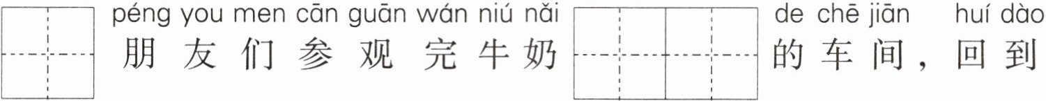 $\overset{\mathrm{x}\mathrm{i}\mathrm{ǎ}\mathrm{o}}{\begin{array}{|c|}\hline \mathrm{ } \\ \hline\end{array}{\begin{array}{|c|}\hline \mathrm{ } \\ \hline }朋友们参观完牛奶\overset{\mathrm{g}\mathrm{ō}\mathrm{n}\mathrm{g}\mathrm{ }\mathrm{c}\mathrm{h}\mathrm{ǎ}\mathrm{n}\mathrm{g}}{\begin{array}{|c|c|}\hline \mathrm{ } & \mathrm{ } \\ \hline\end{array}{\begin{array}{|c|c|}\hline \mathrm{ } & \mathrm{ } \\ \hline }$的车间,回到$\overset{\mathrm{m}\mathrm{é}\mathrm{n}\mathrm{ }\mathrm{w}\mathrm{è}\mathrm{i}}{\begin{array}{|c|c|}\hline \mathrm{ } & \mathrm{ } \\ \hline\end{array}{\begin{array}{|c|c|}\hline \mathrm{ } & \mathrm{ } \\ \hline }$室前集合。