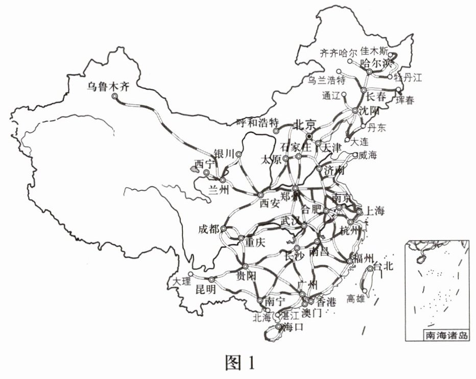 “沧桑巨变七十载,民族复兴铸辉煌”。高速铁路承担客运服务,发展迅速,已成为国家名片。图1为中国主要高速铁路分布图,读图,完成1-2题。