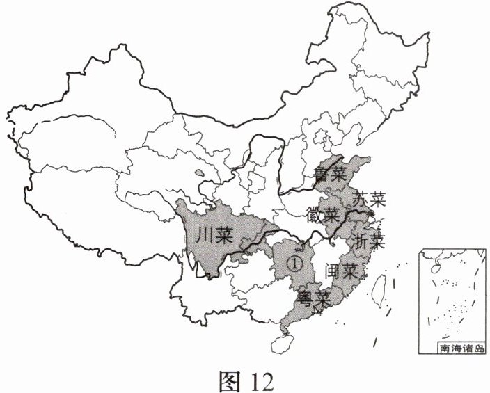 23. 读中国八大菜系分布图(图 12),完成下列问题。(6 分)
