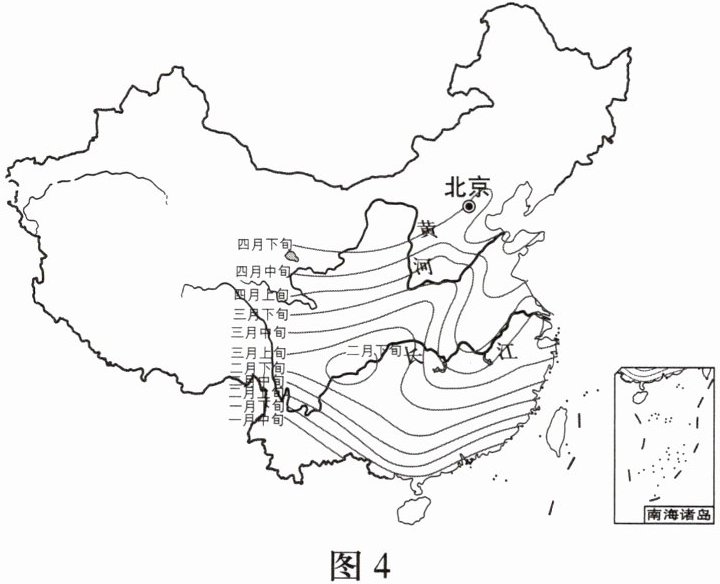 在北方,“一树繁花是春,枝头绿叶亦是春”。图4为中国东部桃树年平均始花期分布图。读图,完成7-9题。