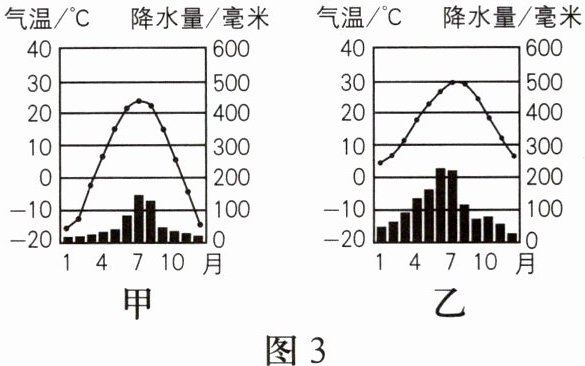 图3为我国东部季风区甲、乙两地的气候资料图。读图,完成5-6题。