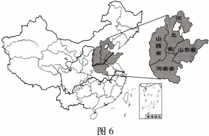 “山河四省”是指山西、河北、山东、河南四省,位于我国北部黄河流域,地处华北平原和黄土高原的交会地带,是中华文明的发祥地,也是我国重要的农业大省。图 6 为“山河四省”位置图。读图,完成 6 - 7 题。