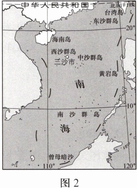 三沙市地处海南省南部,辖西沙群岛、中沙群岛、南沙群岛的岛礁及其海域,陆海面积约200万平方千米。2024年11月10日,我国民政部、国家邮政局公布西沙区、南沙区的行政区划代码和邮政编码。同日自然资源部正式发行三沙市新版地图。图2为南海地区图,读图,完成5-6题。