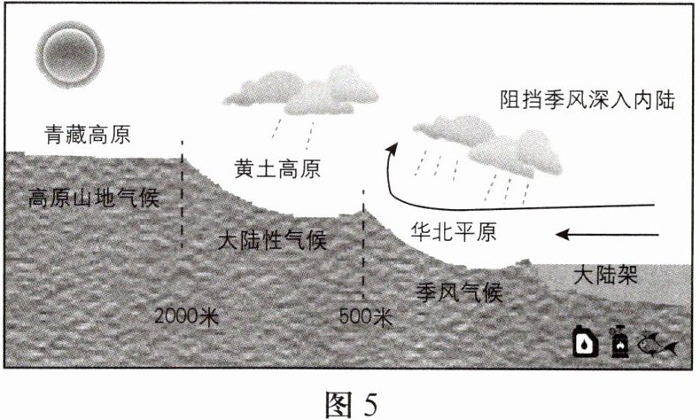 1.A 2.B 【解析】1.图示为地势呈阶梯状分布对来自海洋湿润气流的影响,揭示的是我国西高东低的地势对气候的影响,A正确;跟植被、交通和资源分布无关,B、 C、D错误。故选A。 2.图示展示的是我国地势特点、部分地区的海拔高度特点以及与气候的关系。从图中可以看出,黄土高原比华北平原地势高;我国地势西高东低,导致东西部地区降水差异显著;与我国沿海大陆架石油、渔业资源丰富无关。故选B。