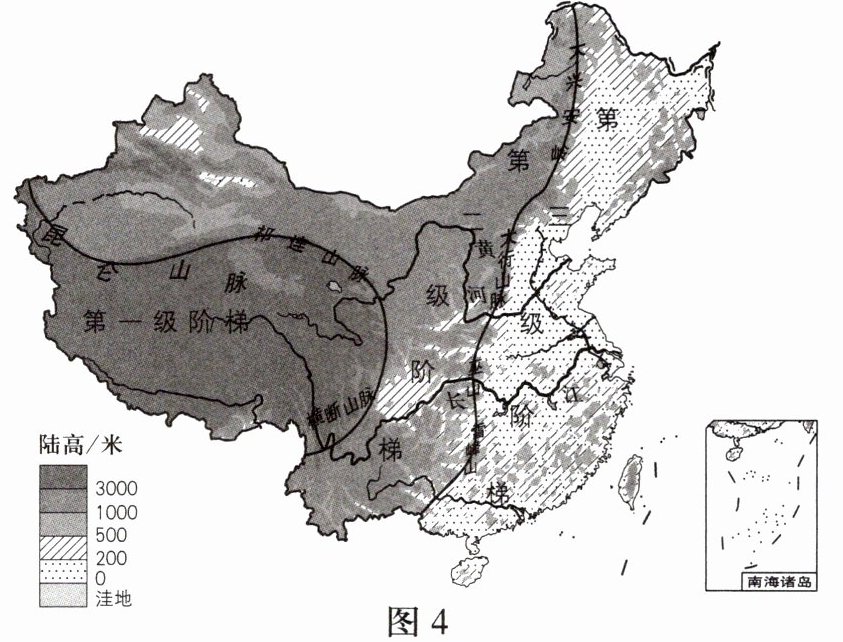 9. 图 4 为中国地势三级阶梯图。读图,完成下列问题。