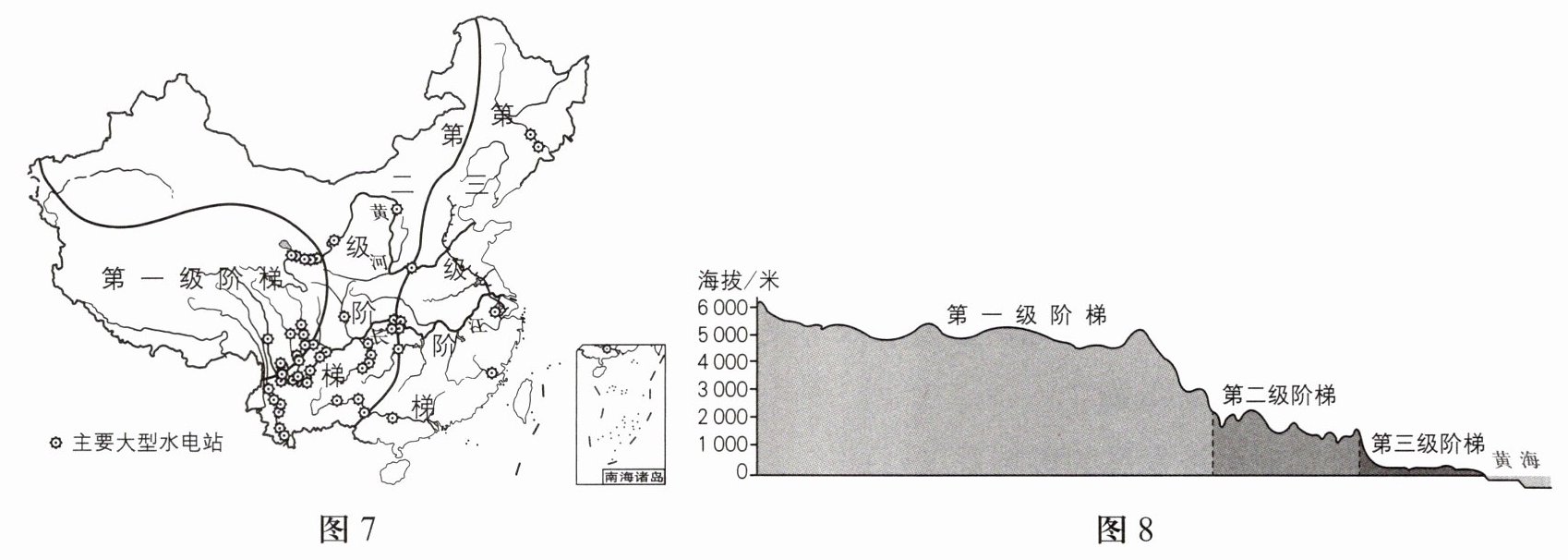材料二 图 7 为中国主要大型水电站分布图,图 8 为中国沿 $ 36^{\circ}N $ 纬线附近地形剖面示意。