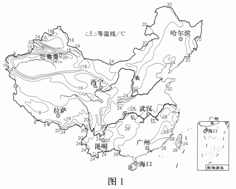 图1为中国7月等温线分布图。读图,完成1-3题。