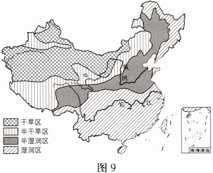 每年5月21日前后为我国小满节气。南方地区民谚“小满小满,江河渐满”,含义是小满节气开始雨水开始增多,江河水位上涨。图9为中国干湿地区分布图。据此完成5-6题。