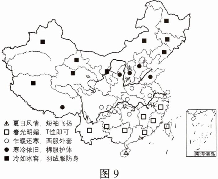 穿衣指数是根据自然环境对人体感觉温度的影响,以及对天气状况、气温、湿度、风等气象要素的分析研究,从中总结出的一种旨在提醒人们看天穿衣的气象指数。图9为我国2024年某日穿衣指数地图。读图,完成4-6题。