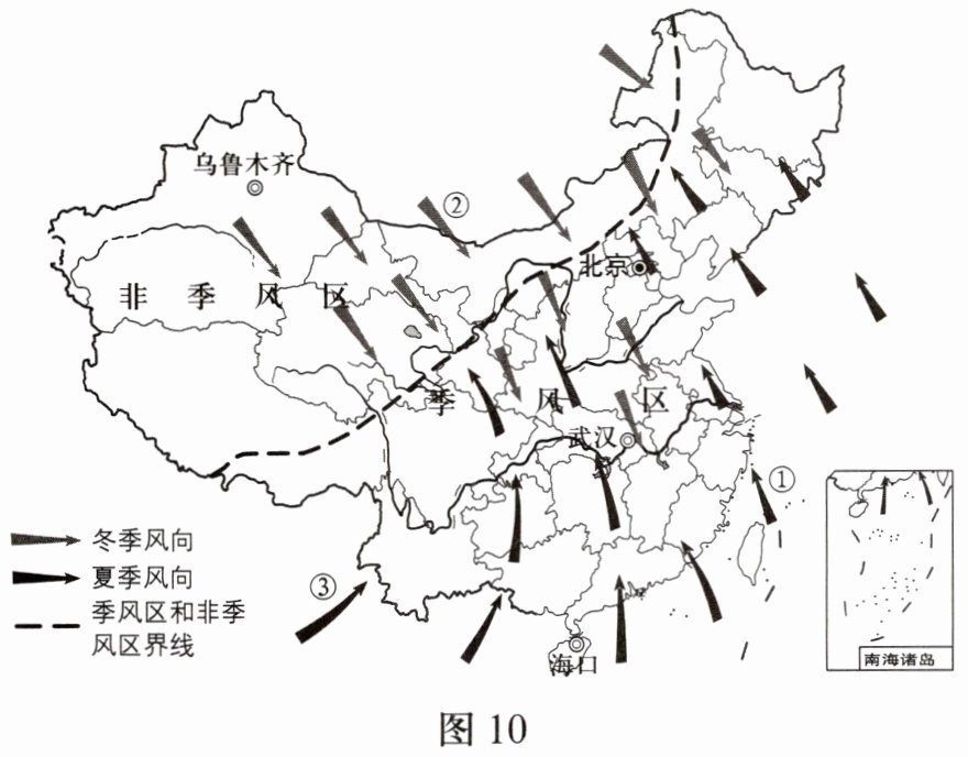 7. 图10为影响中国的冬夏季风示意图。