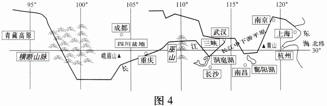 推动长江经济带发展要坚持走生态优先、绿色发展之路。图4为30°N和长江沿岸地理事物分布。读图,完成1-4题。