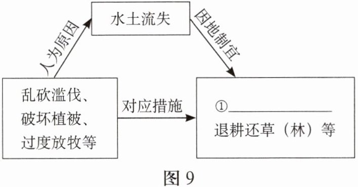 。3. 同学们来到图 7 中 A 地区时,看到此地水土流失现象十分严重,塑造了______的地表形态,深深体会到了“黄河奔浊浪,是天生不清”。请将图 9 补充完整:①______。